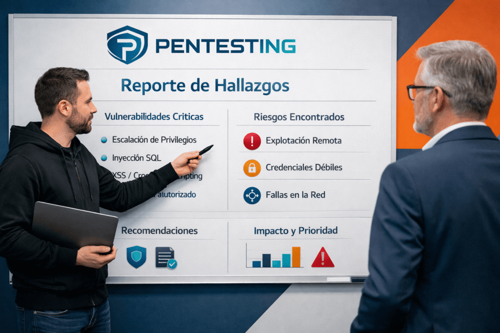 Un reporte de una prueba de pentesting debe detallar las vulnerabilidades detectadas, la metodología utilizada y, lo más importante, las recomendaciones de remediación. Sin un reporte claro, los hallazgos técnicos se quedan en papel mojado sin impacto real en la ciberseguridad de la empresa. Un reporte de calidad debe contener: